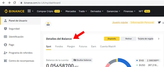 1. Una vez dentro de tu cuenta del exchange seleccionar “Detalles del Balance” del dashboard principal