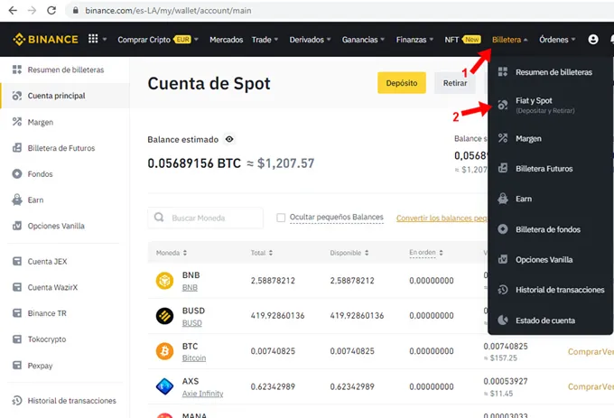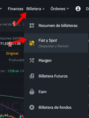 3. Seleccionar del menú horizontal superior “Billetera” (1) y del menú que se despliega seleccionar “Fiat y Spot” (2)