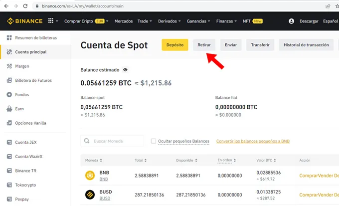 1. Sobre la cuenta Spot buscar la opción “Retirar” y la seleccionarla