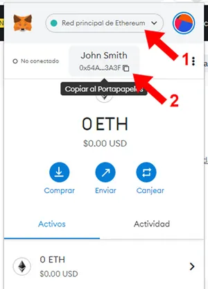 3. Sobre tu wallet Metamask asegúrate de haber seleccionado la “Red Ethereum” (1) y luego presionar click en el ícono para copiar la dirección de nuestra wallet (2) , esta acción la cargará en el buffer del ordenador para posteriormente poder pegarla en nuestro exchange o si lo deseas poder enviarla por algún sistema de mensajería en caso que estés operando el exchange en otro equipo