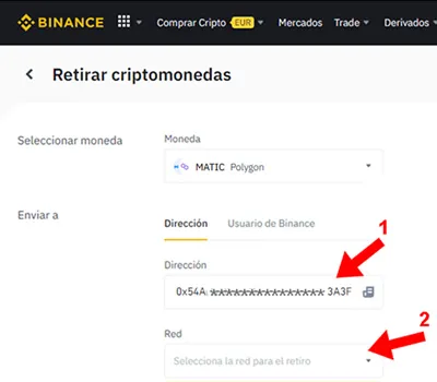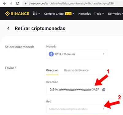4. En la sección “Enviar a” donde dice “Dirección” (1) pegar la dirección obtenida de la wallet y seleccionar justo abajo donde dice “Red” (2), entonces mostrará la siguiente pantalla: