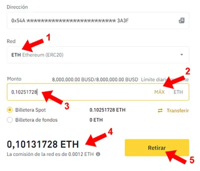 6. Verificar la selección correcta de “ETH – Ethereum (ERC20)” (1) , en “Monto” solicita el importe en ETH, no en dólares, en este ejemplo necesitas enviar el total del balance de ETH a la wallet, entonces presionar directamente el botón “MAX” (2), en caso de necesitar transferir un monto parcial y no el total del balance en ETH necesitas tipear el valor en ETH (3). Si conoces el monto en dólares necesitas hacer la conversión manualmente, por ejemplo, en este caso necesitas enviar 127 USD, el valor actual del ETH es de 1.250 USD aproximadente, por lo tanto aplicar la siguiente división: 127 / 1250 = 0,1016 . En este ejemplo al presionar “MAX” (2) autocompletará un valor similar que corresponde al total dek saldo en ETH. Si en cambio conoces exactamente la cantidad de ETH que necesitas enviar es más fácil y la tipearás directamente sin realizar los cálculos. Abajo a la izquierda del botón “Retirar” se muestra la comisión que descontará del monto enviado, en este caso 0,0012 ETH (4) , cuyo cálculo en dólares sería 0.0012 * 1.250 = 1,5 USD en este ejemplo. Finalmente presionar el botón “Retirar”, esto iniciará un proceso de retiro que puede durar unos minutos.