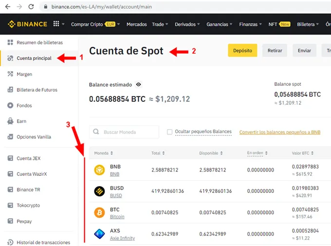 2. Seleccionar “Cuenta principal” (1) y verificar estar posicionado en el balance de la billetera Spot (2). Hecho esto ir al detalle de las criptomonedas que tienes en el balance (3) y verificar saldo disponible en ETH y/o MATIC.