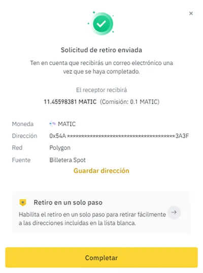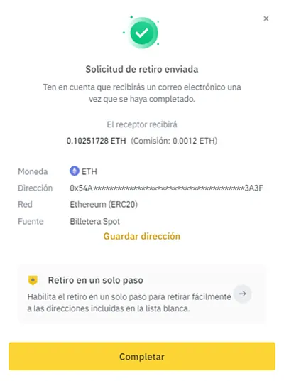 9. Muestra la solicitud de retiro como “enviada” entonces debes presionar el botón “Completar”: