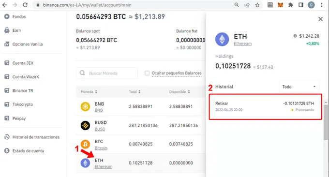 11. Volver a tu billetera Spot del exchange y sobre el balance de ETH presionar click (1) , abrirá una ventana con el saldo en ETH y al pie mostrará el historial de operaciones (2) donde se puede observar la operación que has ingresado en estado “Procesando”, por eso los fondos todavía no fueron descontados