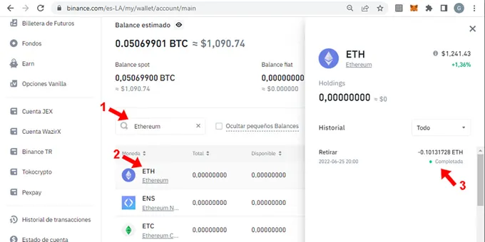 12. Recargar la página de billetera Spot, si se ha completado el proceso de retiro probablemente ya no aparezca ETH en el balance debido a que, si se ha retirado el total, ha quedado en cero. Entonces ingresar en el filtro de la billetera “Ethereum” (1) , nos lista ETH , presionar click en ETH (2) y sobre la derecha muestra que el retiro (envío a la wallet Metamask) fue completado correctamente (3)