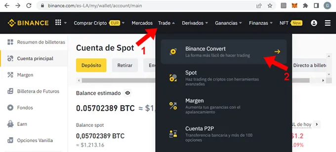 1. Seleccionar del menú horizontal “Trade” (1) y del menú que se despliega seleccionar “Binance Convert”. Luego mostrará una página similar a la siguiente: