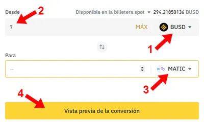 2. En “Desde” sobre la derecha seleccionar la moneda BUSD (1). Ingresar la cantidad de BUSD a convertir (2) y en “Para” sobre la derecha seleccionar MATIC (3). Confirmar presionando “Vista previa de la conversión” (4)