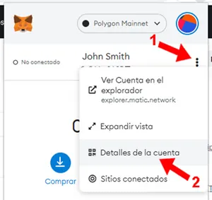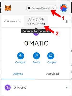 3. Sobre la wallet Metamask necesitas asegurarte de haber seleccionado “Poligon Mainnet” (1) y luego presionar click en el ícono de copiar la dirección de la wallet (2) , esta acción la cargará en el buffer del ordenador para posteriormente poder pegarla en nuestro exchange o si lo deseas poder enviarla por algún sistema de mensajería en caso que estés operando el exchange en otro equipo