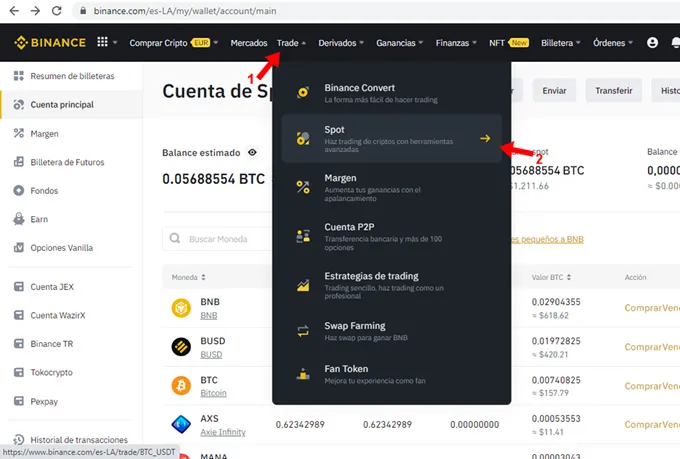 1. Seleccionar del menú horizontal “Trade” (1) y del menú que se despliega seleccionar “Spot”. Luego mostrará una página similar a la siguiente: