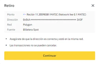ATENCION: el proceso de retiro del exchange a la wallet pude demorar desde unos minutos hasta varias horas, depende del congestionamiento de la red Polygon. Por lo tanto es posible que los fondos se reflejen en nuestra wallet Metamask en unos instantes o que pasen varias horas hasta que lleguen correctamente