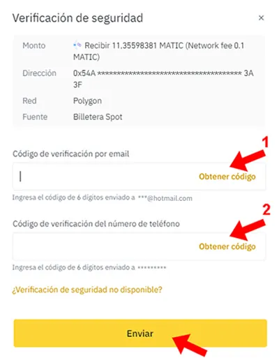 8. Esta pantalla necesita verificar que tu eres el titular de la cuenta y para ello solicita una doble validación de datos enviando un código de verificación a tu cuenta de e-mail y otro código de verificación por SMS a tu celular. Depende del exchange esta verificación podría variar. En este caso te tienes que asegurar de tener nuestra cuenta de e-mail abierta y tu celular a mano. Luego presionar “Obtener código” (1) en la casilla para verificar la dirección de e-mail, esperar a que llegue el e-mail con el código de verificación y transcribirlo. Luego presionar “Obtener código” (2) en la casilla para verificar el número de teléfono, esperar a que llegue el SMS de con el código de verificación y transcribirlo. Por último presionar “Enviar” y el proceso de retiro/envío de fondos a tu wallet Metamask se iniciará si la información que has ingresado fue la correcta.