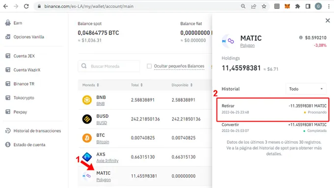 11. Volver a tu billetera Spot del exchange y sobre el balance de MATIC presionar click (1) , abrirá una ventana con el saldo en MATIC y al pie mostrará el historial de operaciones (2) donde se puede observar la operación que has ingresado en estado “Procesando”, por eso los fondos todavía no fueron descontados