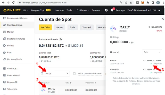 12. Recargar la página de billetera Spot, si se ha completado el proceso de retiro probablemente ya no aparezca MATIC en el balance debido a que, si se ha retirado el total, ha quedado en cero. Entonces ingresar en el filtro de la billetera “Matic” (1) , nos lista MATIC , presionar click en MATIC (2) y sobre la derecha muestra que el retiro (envío a la wallet Metamask) fue completado correctamente (3)