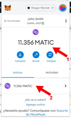 Ahora necesitas verificar el saldo de MATIC de la wallet Metamask: