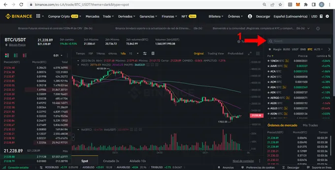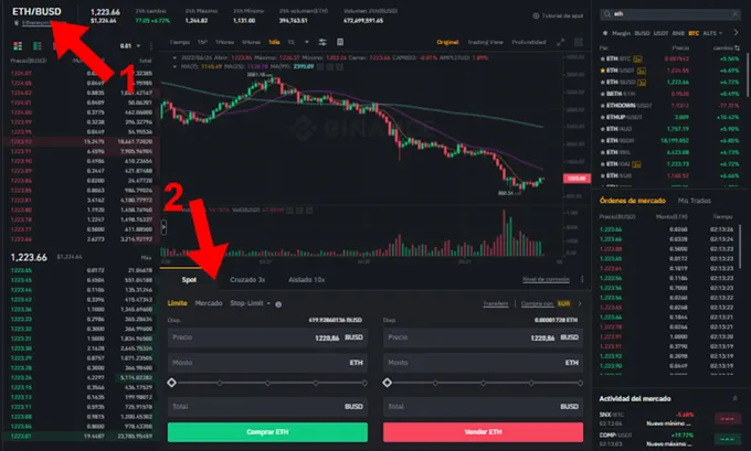 2. Ir al casillero de arriba a la derecha (1) para buscar la criptomoneda que se necesita comprar, en este caso ETH
