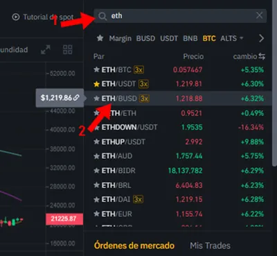 3. Tipear ETH en el casillero de búsqueda (1) y la ventana desplegable filtrará todas las opciones. Para este caso seleccionar el par ETH/BUSD (2). Luego mostrará la siguiente pantalla: