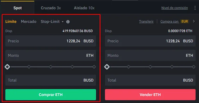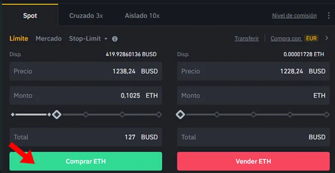 De acuerdo al balance del ejemplo no hay saldo disponible en ETH, por lo tanto compraremos 127 USD en ETH en el mercado de criptomonedas de Binance haciendo uso de la stablecoin BUSD. Pero si tu lo deseas puedes hacer uso de cualquier otra stablecoin o criptomoneda para comprar ETH.