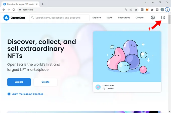 1. Cargar la home page de OpenSea y presionar sobre el botón “Wallet” (1) arriba a la derecha