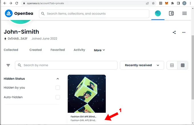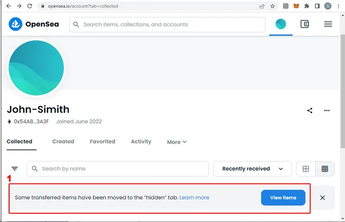 (1) Se muestra una advertencia de OpenSea indicando que algunos “items” han sido transferidos a nuestra cuenta pero que han sido movidos a una carpeta oculta. Sin embargo nos invita a abrir esa carpeta para ver los items transferidos. Un “item” es el equivalente a 1 NFT en nuestra cuenta. Por ejemplo si nuestra cuenta tiene 3 items quiere decir que somos propietarios de 3 NFTs