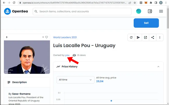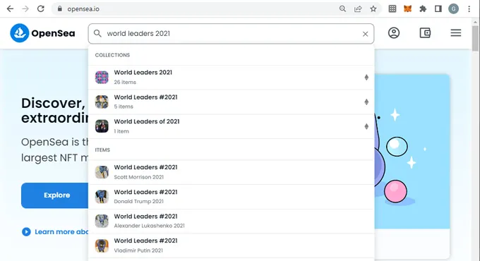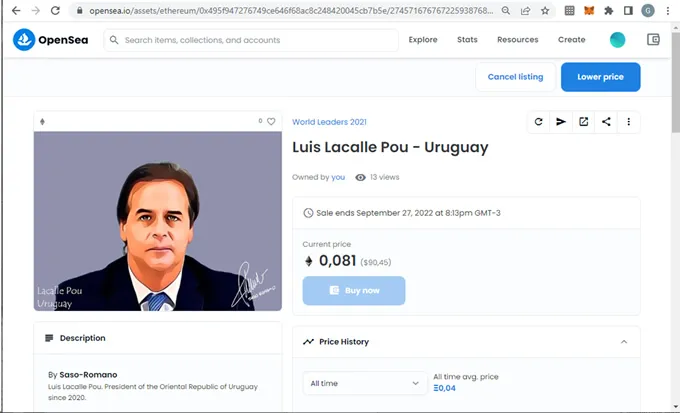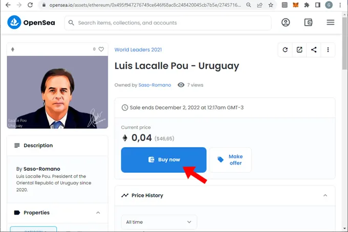 Compraremos el NFT de menor valor sobre la colección “World Leaders 2021” del artista Saso Romano. Para ello seguiremos los siguientes pasos: