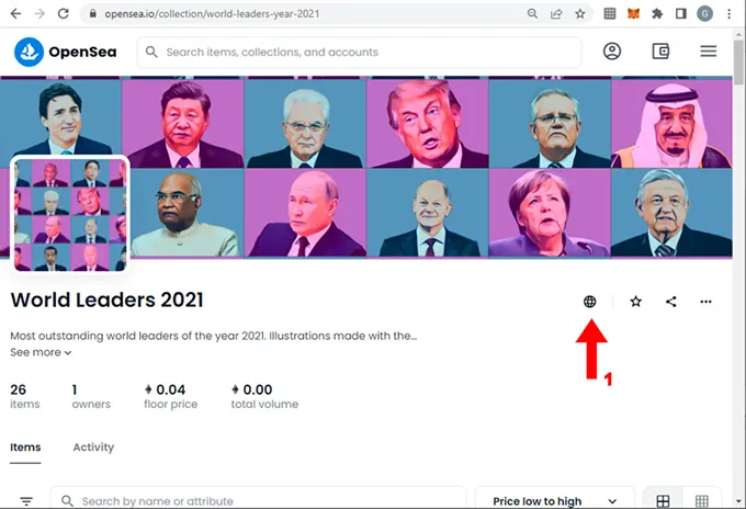 2. Una vez dentro de la colección, como buena práctica puedes verificar los íconos que están al margen derecho del nombre de la colección, justo debajo del banner de presentación, en este caso se observa el ícono de un sitio web asociado a la colección (1). En otras colecciones tal vez encuentres íconos de Twitter, Instagram, Discrod, Telegram, etc. Toda esta información sumada al precio es importante considerarla a la hora de tomar la decisión de comprar un NFT que pertenece a la colección.