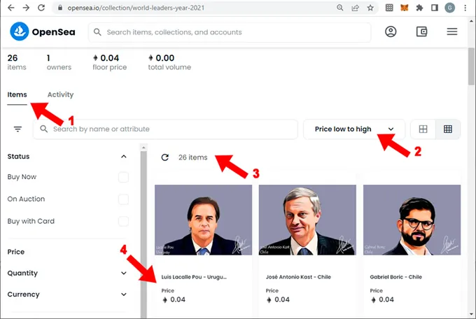 3. Si bajas un poco en el browser necesitas verificar que esté seleccionada la pestaña “Items” (1) y para este ejemplo vamos a ordenar la colección del precio mas bajo al mas alto (2). Leemos que la colección tiene un total de 26 NFTs (3). Es interesante navegar por cada uno de estos items, nosotros a efectos de este tutorial elegiremos el primero de todos, uno de los más económicos (4) y le damos click