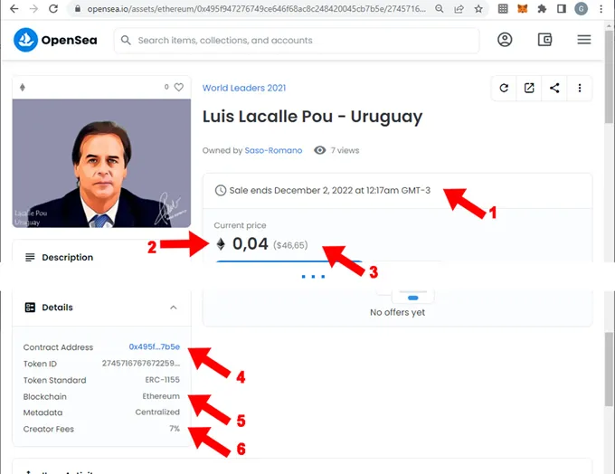 - (6) Indica la comisión que se llevará el creador del NFT por cada vez que este NFT sea re-vendido. Esta comisión suele variar entre 5% y 20% para algunos casos. Nuestra opinión es que una comisión baja ronda entre el 5% y 7%
