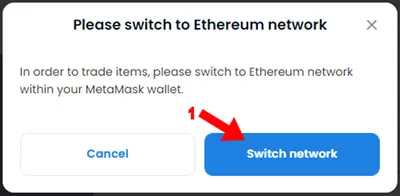 6. En este caso estamos comprando un NFT creado sobre la red Ethereum y en nuestra wallet teníamos seleccionada la red Polygon. Por lo tanto solicita que cambiemos a la red Ethereum de nuestra wallet para poder disponer de los fondos desde dicha red. Presionamos click en “Switch network” (cambiar red)
