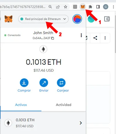 8. Al chequear nuestra wallet desde el navegador haciendo click en la barra de extensiones sobre el ícono de Metamask (1) nos abre la wallet y notamos que ahora está seleccionada la red Ethereum (2)