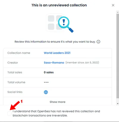 10. Lanza una advertencia diciendo que OpenSea no ha revisado esta colección y que tu eres responsable de haber realizado todos los chequeos necesarios para evitar caer en una estafa, esto quiere decir, que no se trate de una copia de una colección original o bien de una imitación. Ya hemos comentado sobre esto anteriormente y hemos profundizado el tema en el artículo “¿Es conveniente comprar un NFT de una colección sin verificar por OpenSea?”. OpenSea tiene cientos de miles de NFTs y colecciones de NFTs creados sobre su plataforma y es razonable que no hayan verificado todas sus publicaciones, por eso es importante hacer tu propia investigación. De todos modos comprar un NFT de una colección verificada por OpenSea sin dudas ofrece un plus de seguridad importante, pero en general son NFTs muy costosos. Si estás de acuerdo presionar click sobre “I understand…” (1)