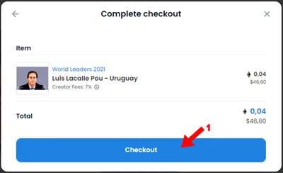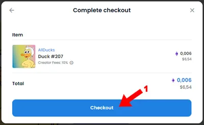 11. Vericar los datos y el precio que vas a pagar expresado en WETH con su conversión a USD y presionar click sobre “Checkout”