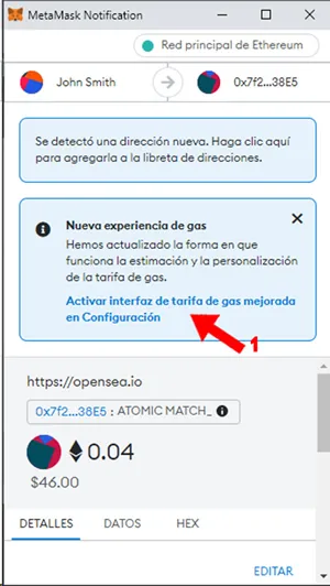 12. OpenSea automáticamente abre la wallet integrada al browser para que desde allí puedas revisar todos los datos asociados a la transacción y finalmente la te invita a “firmar” para dar el OK. Si estás operando por primera vez con tu wallet Metamask como en este caso seguramente solicitará “Activar interfaz de tarifa de gas mejorada en la configuración” (1). El “Gas Fee” que mencionamos al principio del artículo es el importe que nos cobran los mineros por escribir la transacción en la blockchain. Este “Gas Fee” se conoce al momento de escribir la transacción, no antes, sin ambargo existe un algoritmo predictivo que puede dar un valor muy aproximado del ”Gas Fee” que pagaríamos por la transacción. A eso se refiere este punto, han mejorado la predicción de este “Gas Fee” y por supuesto le damos click en activar dicha interfáz (1) en la configuración
