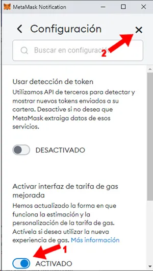 13. Abre la pantalla de configuración de la wallet, entonces presionar click sobre el switch para activar esta interfaz mejorada (1) . Una vez que se muestre “ACTIVADO” cerrar la pantalla de configuración de la wallet presionando click en la “X” de arriba a la derecha (2)