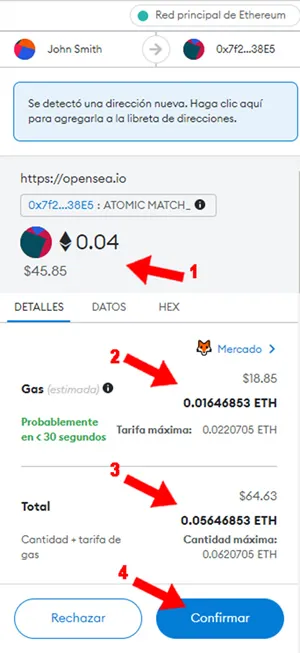 14. Sobre la wallet informa el importe del NFT (1) , el “Gas Fee” aproximado a pagar (2) , el total a pagar (3) solicita confirmar la operación de forma definitiva (4). Presionar click en confirmar y si tienes los fondos suficientes en la wallet que cubra el precio del NFT + “Gas Fee” seguramente la transacción será exitosa.