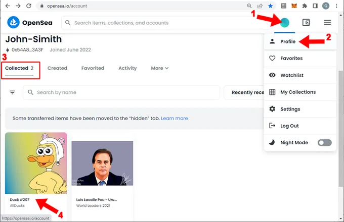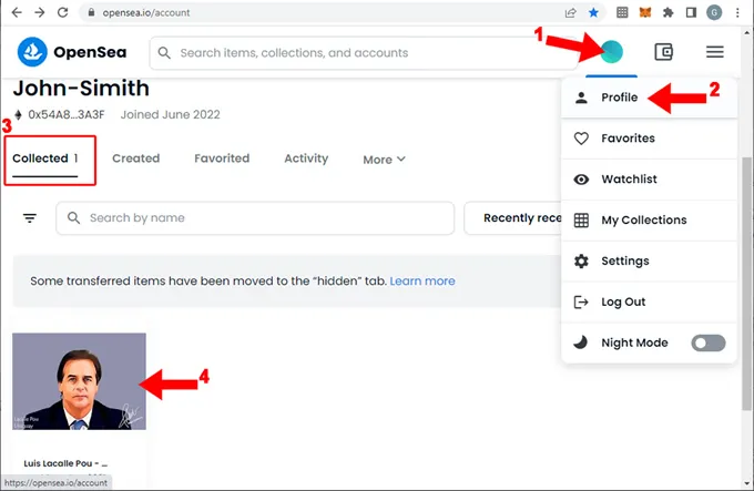 1. Arriba a la derecha al apoyar el mouse en el círculo de tu cuenta (1) se abre una ventana popup, entonces presionar sobre “Profile” (2) . Al cargar el profile se muestran varias pestañas justo debajo de la identificación de la cuenta, seleccionar la pestaña “Collected” (3) si no está seleccionada. Además del mensaje de advertencia que mostramos en el punto anterior, mas abajo se muestran los items (un item es un NFT) que son de tu propiedad. Sobre el NFT que has comprado presionar click (4) y se cargará el detalle del NFT: