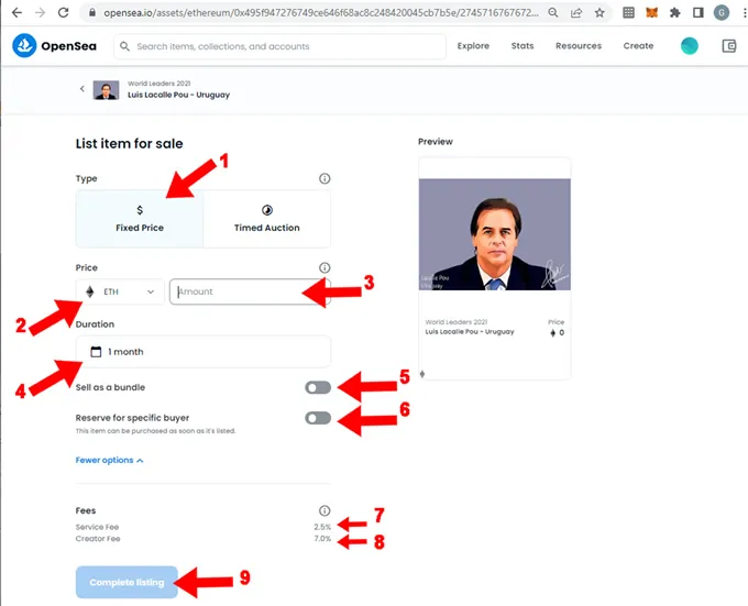 - (9) “Complete listing” presionar click en esta opción para lanzar el proceso de venta cuyos pasos decribimos a continuación