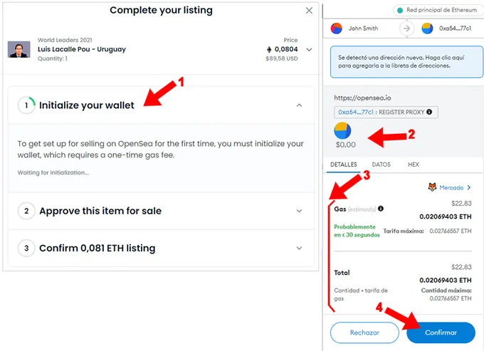 4. Aquí comienza el proceso de venta. OpenSea necesita inicializar la wallet (1) por única vez, para este paso de inicialización la plataforma debe escribir un registro en la blockchain de Ethereum. Como consecuencia de esto necesitas pagar un “Gas fee” para compensar a los mineros de Ethereum por esta transacción. Tal como advierte OpenSea una vez pagado este “Gas fee” para inicializar la wallet nunca más volverá a pedirnos realizar este paso por lo tanto no deberás volver a pagar “Gas fee” para poner a la venta cualquier otro NFT de tu propiedad o este mismo si finaliza su período de venta y necesitarás volver a listarlo para vender. Por eso es importante manejarse siempre con una wallet, ya que si te registras con una wallet distinta creando una nueva cuenta en OpenSea, deberás pagar esta inicialización antes de lanzar la primer venta.