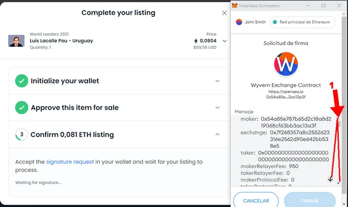 5. Se completó la inicialización de la wallet por única vez y OpenSea aprobó el item (NFT) para la venta. Ahora solicita confirmar la transacción en la wallet. Para eso debes leer el mensaje que muestra sobre la wallet e ir hasta el final (1) . Al llegar al final del mensaje habilitará el botón “firmar” para que pueda completarse la operación.