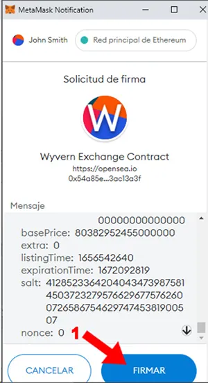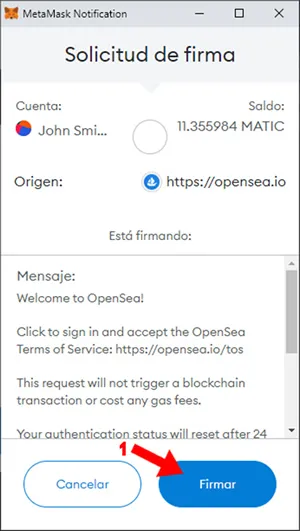 5. Ya sobre la wallet lanza una “Solicitud de firma” que básicamente autoriza a OpenSea a tomar los fondos de la wallet en caso de compra de un NFT y/o para pagar el “Gas Fee” que surja de una compra. Presionar click sobre “Firmar” (1)