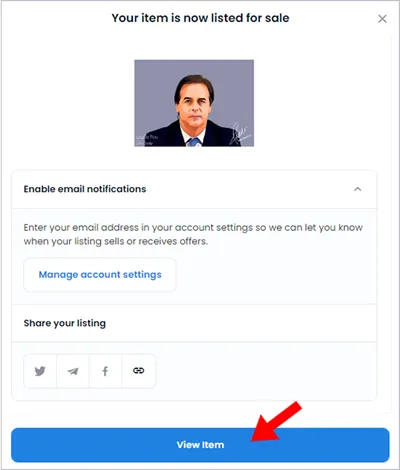 7. Presionar “View Item”, entonces muestra el NFT en venta
