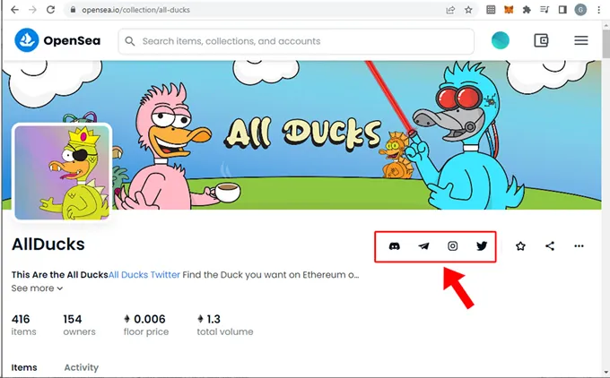 2. Una vez dentro de la colección, como buena práctica puedes verificar los íconos que están al margen derecho del nombre de la colección, justo debajo del banner de presentación, en este caso se observan íconos de Discord, Telegram, Instagram y Twitter asociados a la colección. Toda esta información sumada al precio es importante tenerla en cuenta a la hora de tomar la decisión de comprar un NFT que pertenece a la colección.