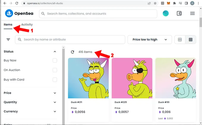 3. Si bajas un poco en el browser necesitas verificar que esté seleccionada la pestaña “Items” (1) y para este ejemplo vamos a ordenar la colección del precio mas bajo al mas alto (2). Leemos que la colección tiene un total de 416 NFTs (2). Es interesante navegar por cada uno de estos items, nosotros a efectos de este tutorial elegiremos el uno de ellos para comprar.
