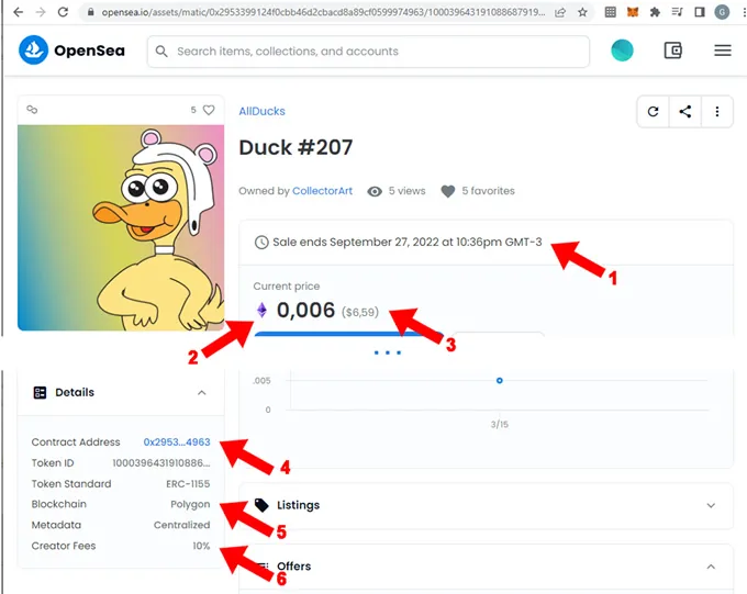 - (1) Indica que el NFT se venderá en la criptomoneda ETH bajo la red Polygon (rombo color violeta identifica a la red Polygon). Si bien figura ETH, al estar operando sobre la red Polygon el futuro comprador deberá pagarlo con el token envuelto WETH replicado en la red Polygon