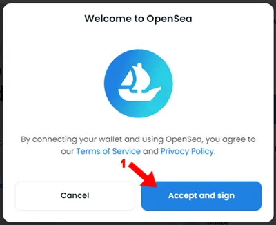 4. Antes de conectar la wallet a OpenSea el sistema solicita aceptar los términos del servicio y firmar el acceso desde la wallet, una vez que estés de acuerdo presionar sobre “Accept and sign” (1) (Aceptar y firmar)