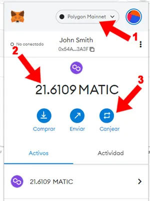 5. Verifica en tu wallet que esté seleccionada la red Polygon (1) . Actualmente contamos con saldo en MATIC (2) (tuvimos que hacer otra operación de transferencia por 10 MATIC porque habíamos calculado un presupuesto insuficiente para comprar este NFT) . Presionar “Canjear” (3) , esto cargará otra pantalla de la wallet