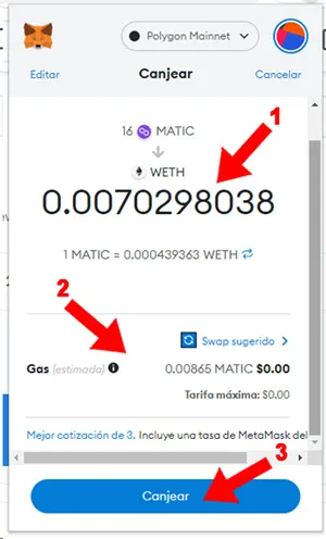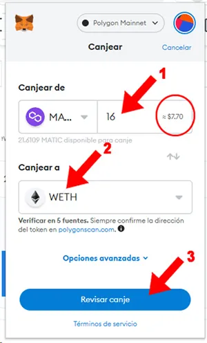 6. Canjeamos 16 MATIC (1) por un valor aproximado a 7.70 USD suficiente para pagar el NFT que seleccionamos, y donde dice “Canjear a” seleccionamos WETH. Presionamos el botón “Revisar Canje” (3)