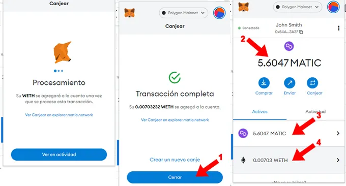 8. Demorará unos segundos el proceso de la transacción, luego indicará un mensaje de transacción completada. Presionar “Cerrar” (1) y cargará a la pantalla principal de la wallet donde se muestra el saldo en MATIC con el monto canjeado descontado (2) y (3) y agregó una nueva fila indicando el saldo en WETH (4) que necesitaremos para comprar el NFT
