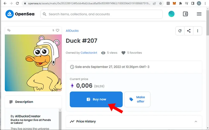 9. Vovler la página del NFT para comprar y presionar “Buy now” (comprar ahora). Si este botón no se muestra quiere decir que el NFT no está a la venta. Para ese caso o si quisieras hacer una oferta de compra de menor valor puedes presionar el botón “Make Offer” realizar oferta e ingresar la cantidad que estás dispuesto a pagar por este NFT. Ya sea para comprar o para ofertar sobre un NFT creado en la red Polygon necesitas que tu wallet disponga de saldo de WETH.