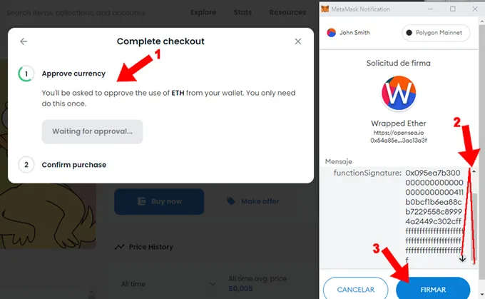 12. Si es la primera vez que haces una operación con WETH, solicitará por única vez que confirmes el uso de WETH de tu wallet (1). En la próxima compra de NFT omitirá este paso. Sobre la pantalla de tu wallet leer todo el texto hasta el final (2) , entonces habilitará el botón “Firmar” (3) que debes presionar
